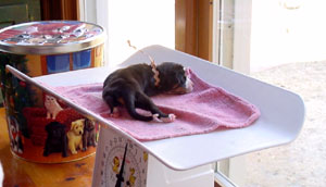 There were new puppies at our dog's breeder's house, so we dashed down get pictures, and get our "puppy fix". They were six days old and tiny. One could curl up in one of your out stretched hands. They were less than one hundredth the size of a full grown Swissy.
